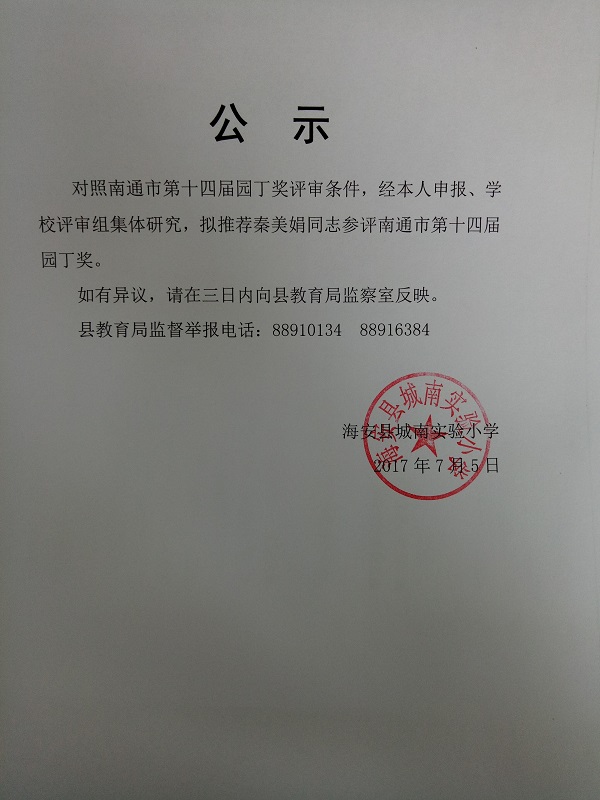 秦美娟申报南通市第十四届园丁奖公示
