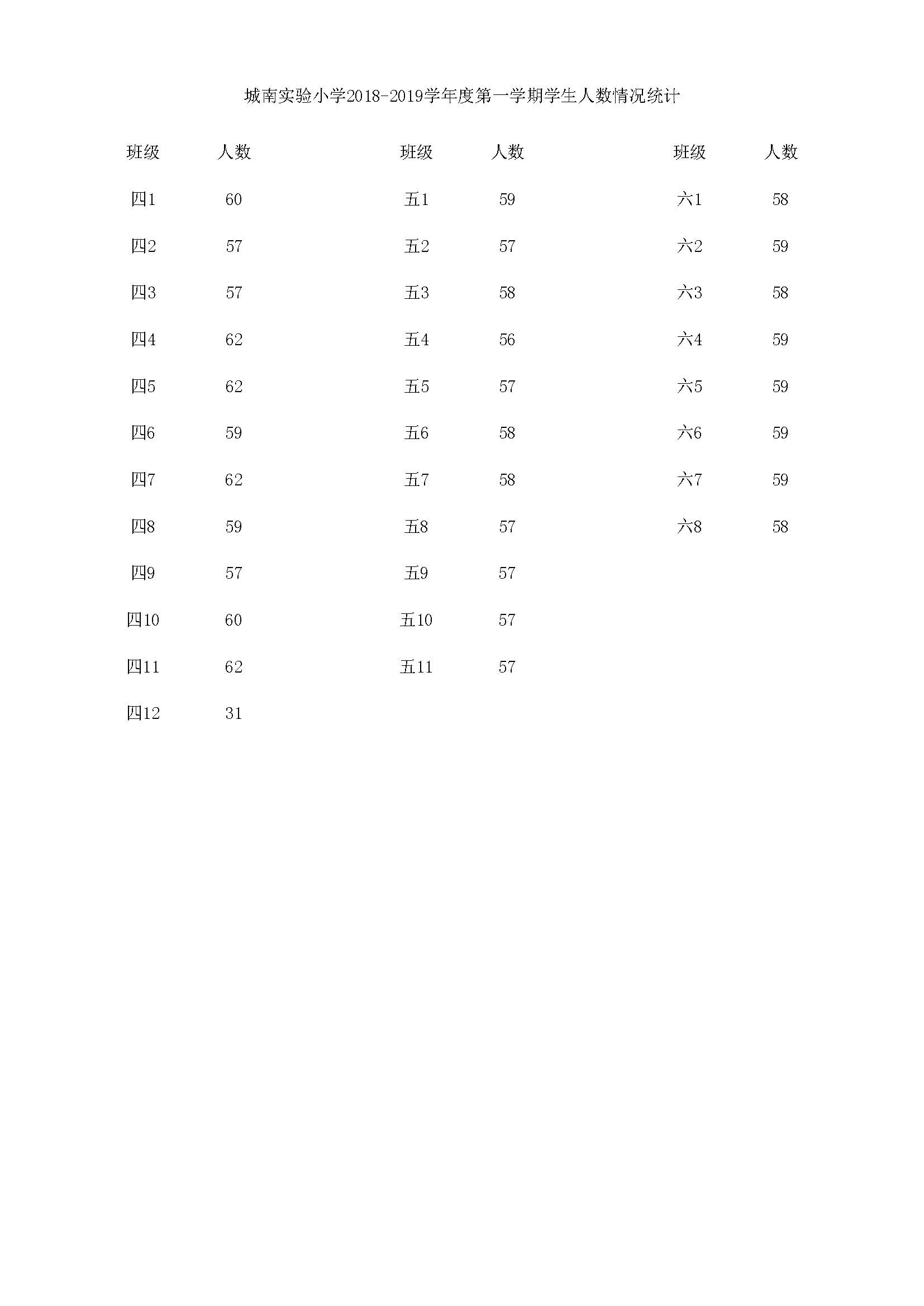 城南实验小学2018-2019学年度第一学期学生人数情况统计