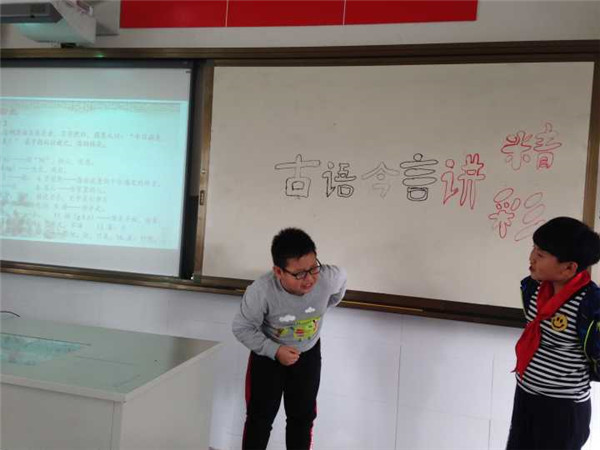 活动期间,最有趣味的当属“古语今言讲精彩”活动了。此次选取的小古文都是孩子们耳熟能详的寓言小故事,巧妙地变“读”为“讲”。孩子们真正地玩起穿越,一边讲着古文,一边配以神态动作还原故事情境,再与现代语言的碰撞,场面诙谐富有生趣。在讲一讲、演一演中,孩子们对小古文语言的简约、精炼、韵味有了更深层次的体会与感悟。