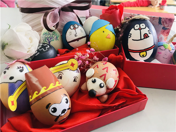 再看蛋宝宝,也是粉墨登场,这些都是大家的杰作!彩笔一挥,可爱的机器猫,萌萌的小姑娘,美丽的风景,蛋宝宝的妆容巧夺天工;也有特别加料的,橡皮泥、彩纸、泡沫等,让蛋宝宝神气起来了,变成了调皮的小老鼠、滑稽的七品芝麻官、可爱的小白兔、诱人的草莓……妙哉!趣哉!