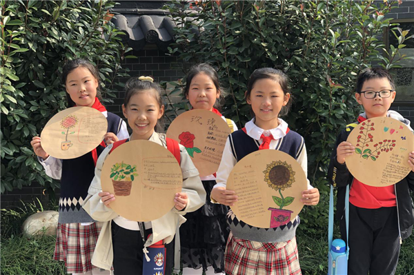 孩子们跟着老师和家长志愿者们且行且赏,东校区不少老师纷纷担起了义务讲解员,孩子们边听边记。西校区四、五年级的孩子们互相介绍着自己认识的植物,有的还把自己制作的植物卡片随身携带着!