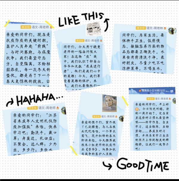 为了提高线上教学的实效,张平老师坚持每天撰写作业总评,王海荣老师鼓励学生自主探究,张海进老师精心制作教学视频,陈海梅老师采用趣味奖惩活跃课堂氛围,他们用钻研精神体现着党员教师的担当与追求;为了使学生的居家生活健康向上,于友凤老师举行以“自律”为主题的云队会,徐晨老师带领队员见证疫情中的中国速度,刘鸷老师开设线上心理微讲座协调亲子关系,陈健梅老师用美食丰富学生的假期生活,吉海燕老师用健康知识微课为抗疫助力,他们以专业素养书写着党员教师的爱心与责任;为了及时准确地上传疫情日报信息,周莉老师耐心细致、不厌其烦地提醒家长,周丽娟主任用“群接龙”串联起年级组每一个成员,吴雪琴校长四十几天如一日在键盘上收发全校师生的信息,坚守属于她的战“疫”阵地,她们用服务意识展现着党员教师的执着与使命;为了保障教学秩序有条不紊,王莉、刘智勇、谭海霞、戴常敏等教研组长身先士卒克服万难做好准备工作,姜金红主任德育、教学两手一起抓,周正娟校长除了录制公益微课,还带队入驻班级群调研和指导教学情况,她们用敬业精神传递着党员教师的无私与奉献!