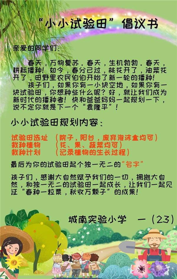 自3月26日中共中央国务院发布《关于全面加强新时代大中小学劳动教育的意见》印发以来,城南实小进一步完善了“德智体美劳”五育并举的学生素质发展体系。近日,西校区在集团劳动教育实施纲要的指引下,开展了“我的小小试验田” 劳动实践活动。