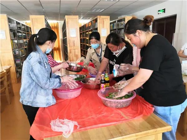 教室里早就打扫干净,桌凳摆放好,铺上一次性桌布,同学们一个个洗手完毕,该到大展身手的时候了。每个班将三种馅料分成9份,6名队员为1组,各拿一份,坐在课桌前认认真真地包着饺子。包饺子对于一些男孩子来说还是第一次,有点困难,圆形的饺子皮被包得奇形怪状的。女孩子们心灵手巧,可以把圆形饺子皮包出花样,折的花边有模有样,不比外面卖的差。