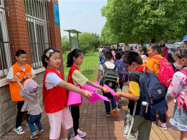 四5中队的队员们,利用放学时间,向全校队员们发出“捍卫知识产权,读正版图书”的倡议。