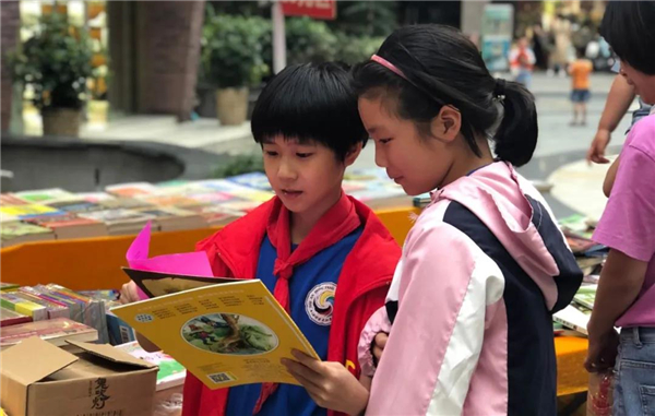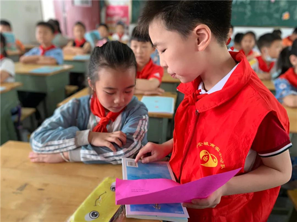 四4中队的队员们走进一年级部,他们从看外观、看纸质、看清晰度等方面,手把手教小弟弟、小妹妹们如何鉴别正版、盗版图书。