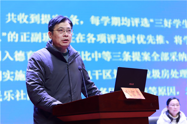 集团副校长许习白作第七届教职工大会提案完成情况与第八届教职工大会提案解答报告。本次大会设立提案主题为“教师专业成长”,共收到提案316份,学校分类合并后在大会上予以细致解答。经组委会合议,本次大会共评选出10份优秀提案,学校领导班子成员为10位提案人现场颁奖。