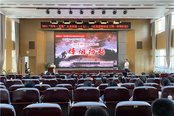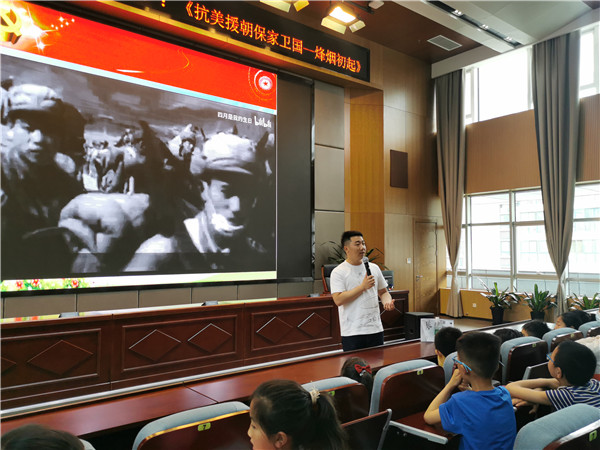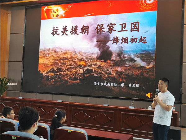 5月29日下午,城南实验小学党员教师景志翔在海安市图书馆四楼报告厅给120多名学生上了一节长达一个半小时的浸润式情境党课——《抗美援朝保家卫国——烽烟初起》。