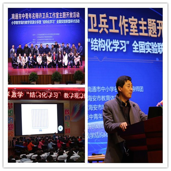 12月27日,南通市中青年名师许卫兵工作室主题开放活动、小学数学简约教学资源分享暨“小学数学结构化学习”全国实验联盟研讨活动在城南实小成功举行。来自新疆、青海、甘肃等12个省、一百多所学校的四百多名教师参加了本次活动。许卫兵校长将城南实小数学教师团队5年研发的江苏省前瞻性教学改革实验项目《着力思维素养的小学数学简约教学资源建设》达58G的实践成果,无私分享给了全国近百所联盟学校,2100多名数学教师、12万学生受益。2018年6月,《小学数学教师》以封面人物推荐、专栏组稿等方式刊发了该项研究的成果,11月,人大复印资料将多篇文章进行全文转载。教育部课程教学中心、南京大学、苏教版教材组、江苏省教科院基教所、南通名师培养导师团的专家领导给以高度赞扬,并对未来发展寄予厚望。
