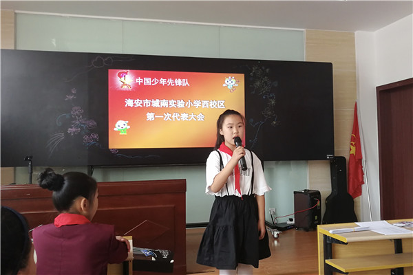 10月18日下午,海安市城南实验小学西校区第一届少代会隆重召开了。出席本次少代会的有队员代表、家长代表及部分辅导员老师。会上,队员们充分行使自己的权利,推选出城南实小西校区第一届大队委委员。
