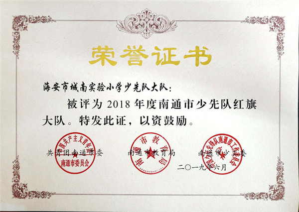 城南实验小学自2013年建校以来,一直秉持“幸福教育”的办学思想,紧紧围绕“立德树人”的根本任务,以“聚焦主责主业,推动改革落地”为少先队工作重点,开展丰富多彩的活动,强化思想政治启蒙和价值引领。学校被评为2016—2018年度“江苏省文明校园”,连续六年蝉联“南通市红旗大队”的光荣称号,在海安市素质教育评估中被评为“五星级学校”。