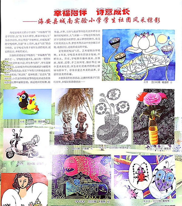 学校着力加强少先队自主教育和实践教育,社团活动全面开花。本部校区美术社团在《江苏教育报·现代家长》封三作整版报道,足球社团活动照片被“人民图片网”收藏。东校区体艺社团花鼓舞荣登“学习强国”平台、《新华日报》,机器人社团活动照片被《半月谈》主题文章选作配图。西校区美术社团活动荣登《光明日报》。