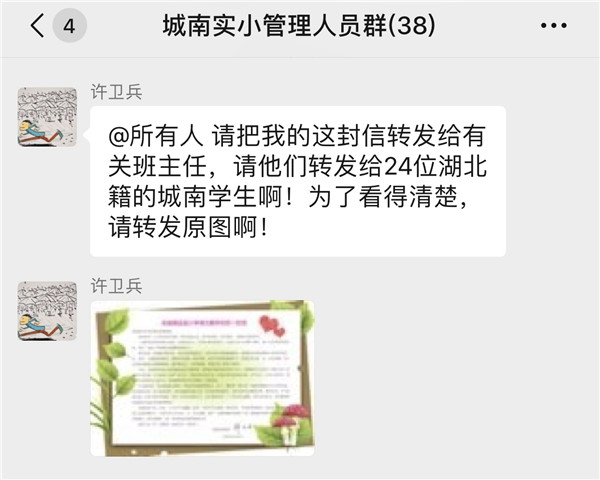 许校长,您好!我是二年级22班杨开备的妈妈,和所有身在湖北的城南娃家庭一样,看到许校长的来信,我深受感动,也倍感温暖。我们感恩于许校长对我们湖北籍学生及家庭的问候与关心,同时也感谢二22班全体师生对我们的关怀与祝福。谢谢大家对我们的挂念。此时此刻,我的心情无比激动,疫情让我们很苦,但背后有你们的关爱,很甜!