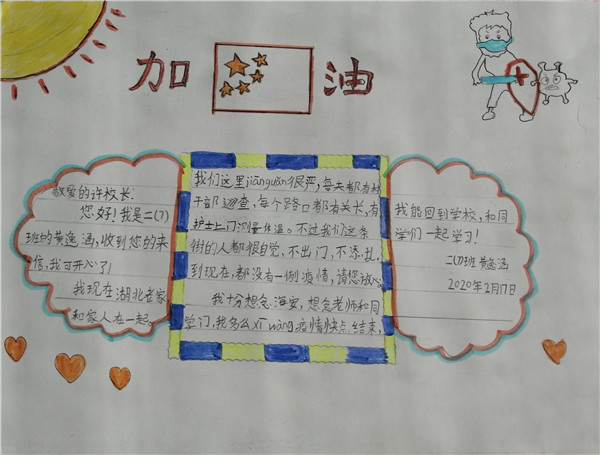 许校长,感谢您百忙中给我们写信!年前我回湖北老家过年,可是万万没有想到的是,在我们这里发生了新型冠状病毒疫情,让好几年没有回家的我一下子跌入了深渊。在全市严防严控的形势下,大街小巷全部封锁,因为我没有和爸爸妈妈同时回家,先去的乡下太奶奶家,所以到现在都是跟爸爸妈妈分开居住的,各自居家隔离至今,从未外出,更不敢外出。