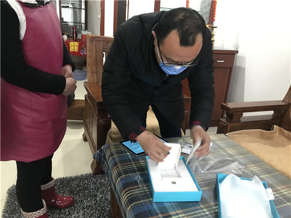 随同的信息技术老师现场为学生安装好软件,调试好设备,现场指导学生学会了如何使用它开始网上学习。