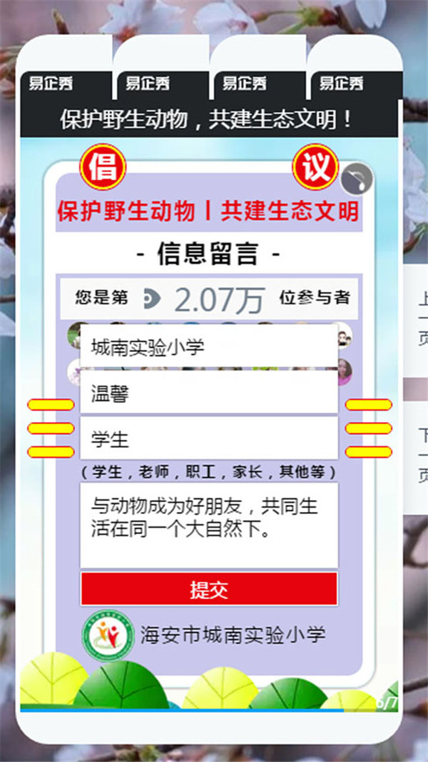 倡议发出后,立即得到了学生、家长和老师的积极响应,仅用1小时20分,参与活动的人数就已破万!广大师生家长不仅自己参与活动,还通过微信转发等方式进行扩散,让更多的人成为生态文明建设的光荣使者。