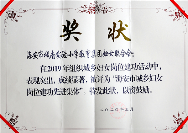 日前,从海安市妇联传来喜讯——海安市城南实验小学妇女联合会在2019年城乡妇女岗位建功活动中,表现突出,成绩显著,被评为“海安市城乡妇女岗位建功先进集体”。这一荣誉的取得是对城南实小女职工岗位服务、岗位业绩的充分肯定和褒奖。