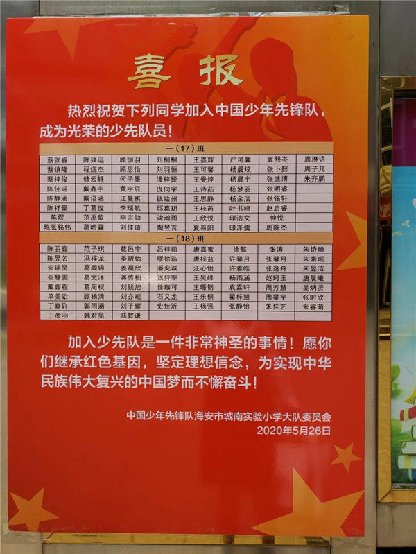 入队前,孩子们在老师的指引和家长的陪伴下,学习“六知、六会、一做”的内容,认真填写入队申请书、队员登记表,并在队旗前拍照留念。一张张灿烂的笑脸,洋溢着入队的无比喜悦。入队喜报上,一个个名字熠熠生辉;站在喜报前,一张张稚嫩的笑脸透露着加入少先队组织的坚定和幸福。