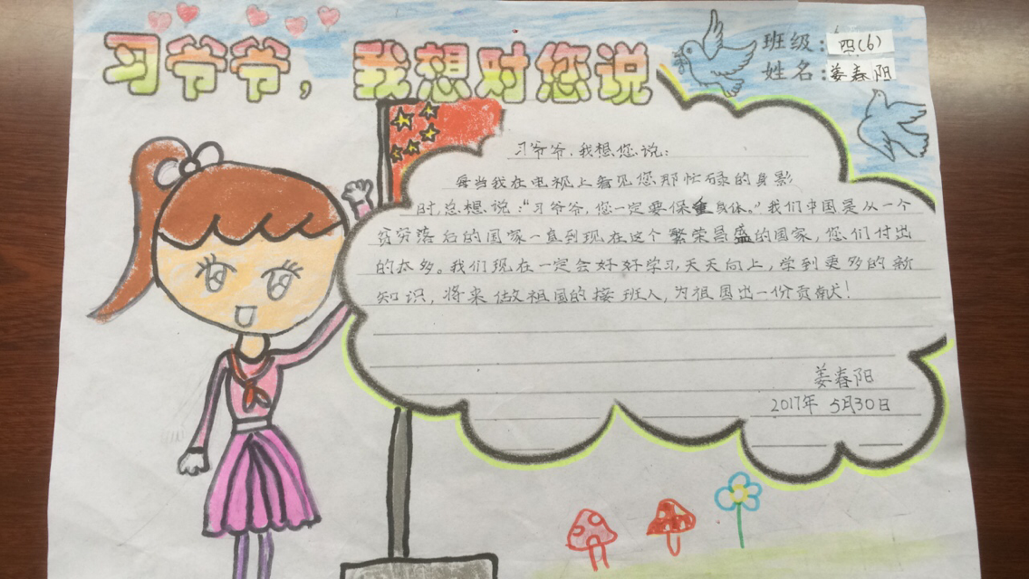 四年级的孩子们举行“童心向党 喜迎十九大”主题活动。老师给大家介绍习爷爷治国“一二三四五”、社会主义核心价值观、十九大概况后,队员们在心愿卡上写下了对习爷爷的心里话。图文并茂的心愿卡,记录了红领巾为梦想而奋斗的决心,满载着对祖国的无限热爱和对习爷爷的美好祝福!